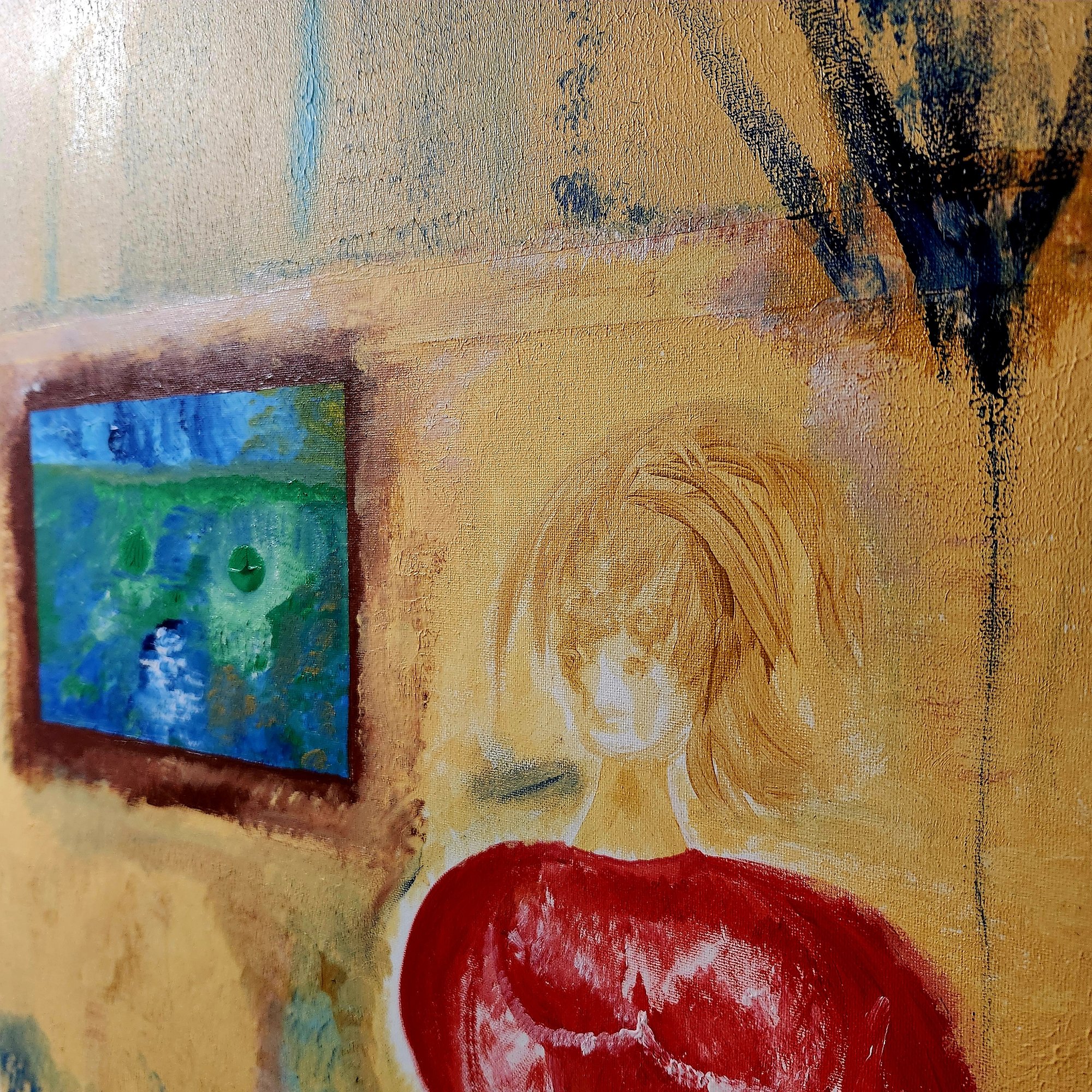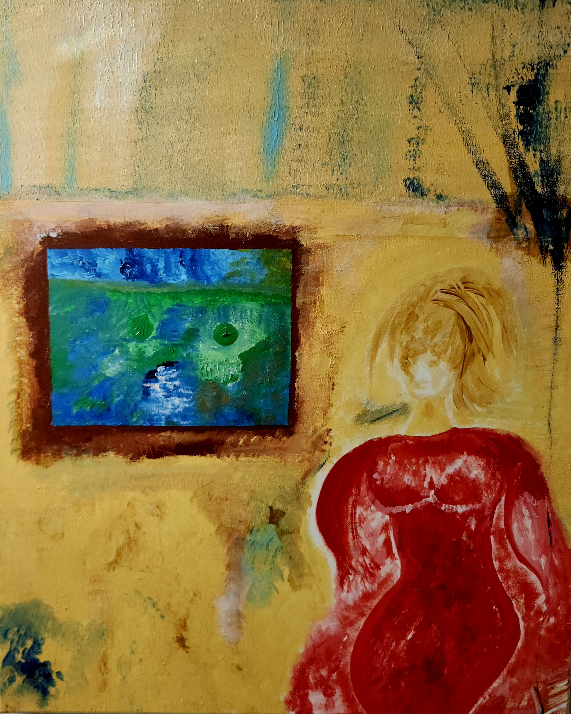 The painting within the painting is a window to another world but is also seen as a strikingly beautiful landscape with water land and sky.